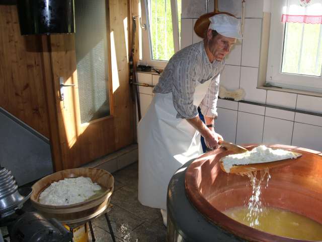Südlich vom Obersee geht es mässig steil hoch zur Grapplialp und auf direktem Weg weiter zur Rautialp. Dort erwartet uns der Alpsenn Siegfried Fischli und seine Frau Myrtha. Während uns Siegfried einen Blick ins Zigerchessi gewährt und mit berechtigtem Stolz etwas über sein traditionelles Handwerk