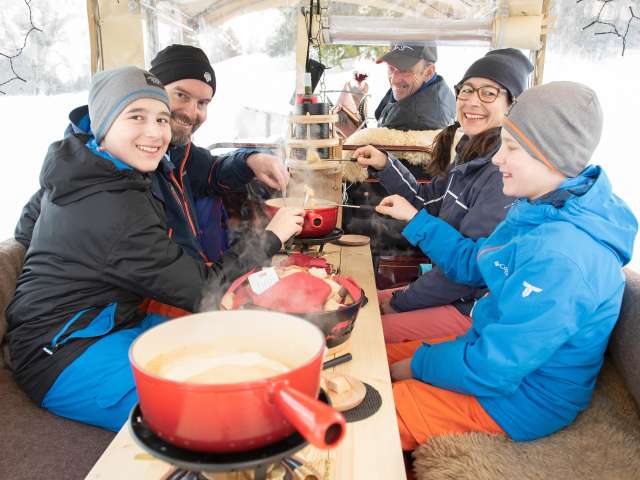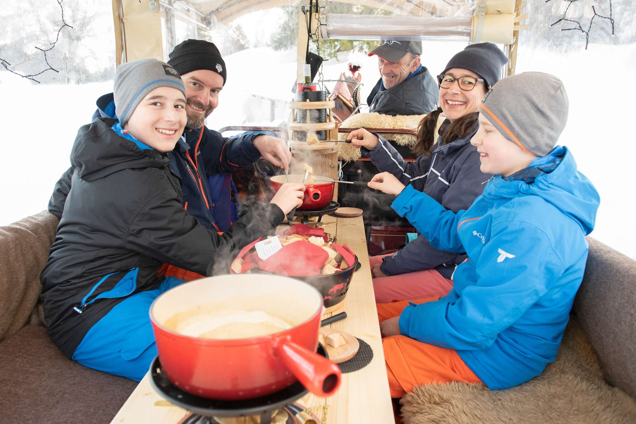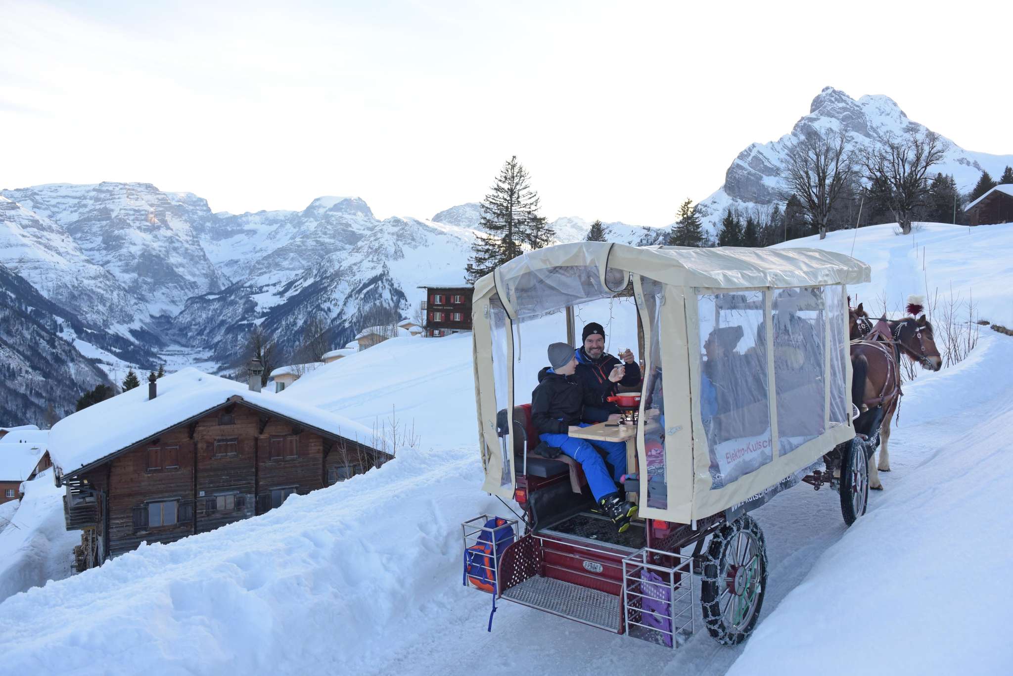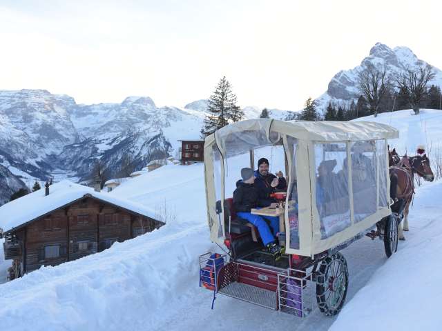 Bei uns gibt es die Möglichkeit, eine gemütliche Pferdekutschenfahrt durch die wunderschöne Landschaft von Braunwald mit einem Apéro, einem gemütlichen Fondueplausch oder einem leckeren Raclette in der Kutsche zu verbinden. Geniesse während der Fahrt mit einer der beiden E-Kutschen ein leckeres Fleisch- oder Käseplättli und dazu ein Glas Wein oder ein feines Käsefondue.