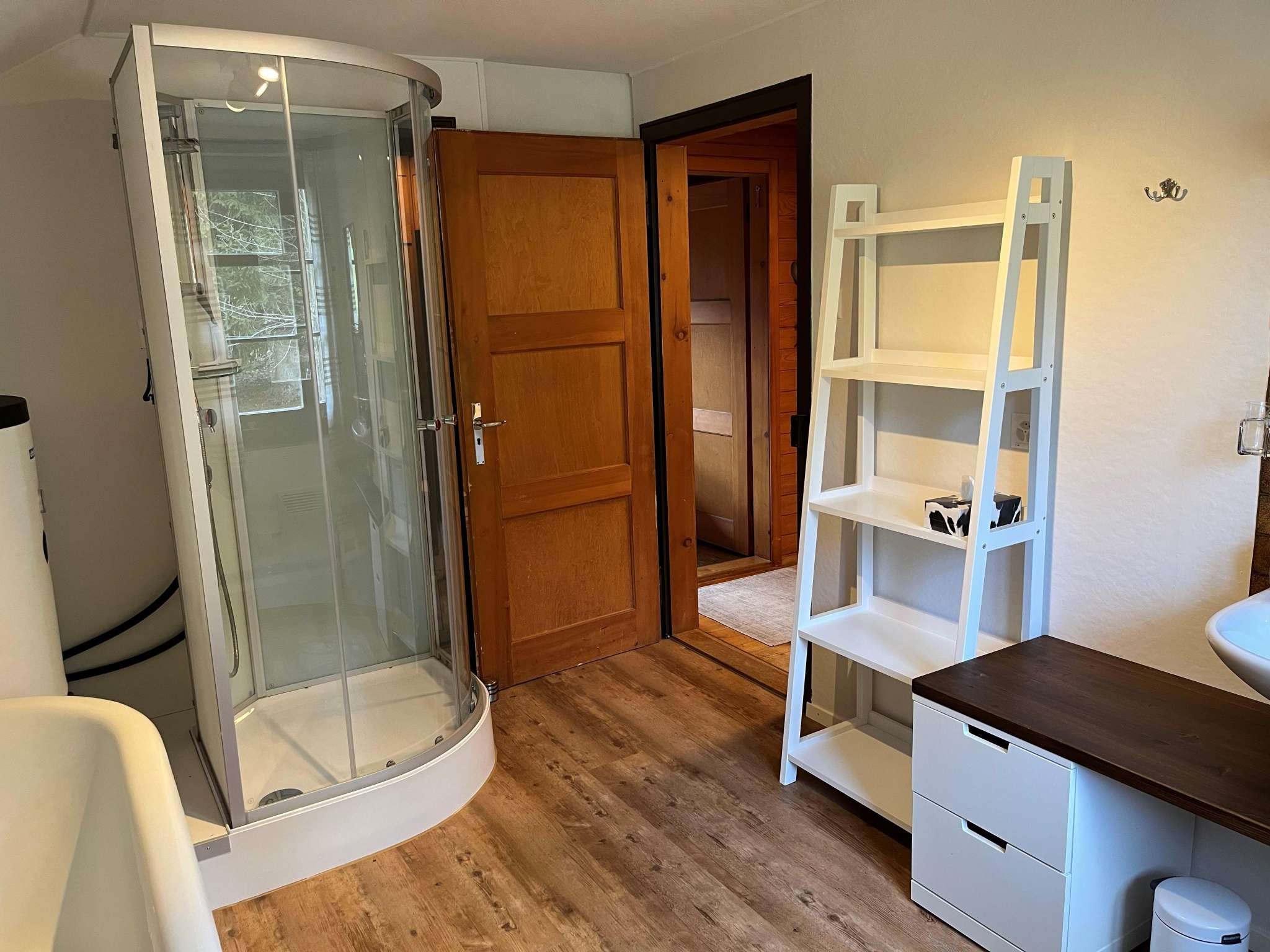 - Badezimmer mit WC, Dusche und Badewanne.