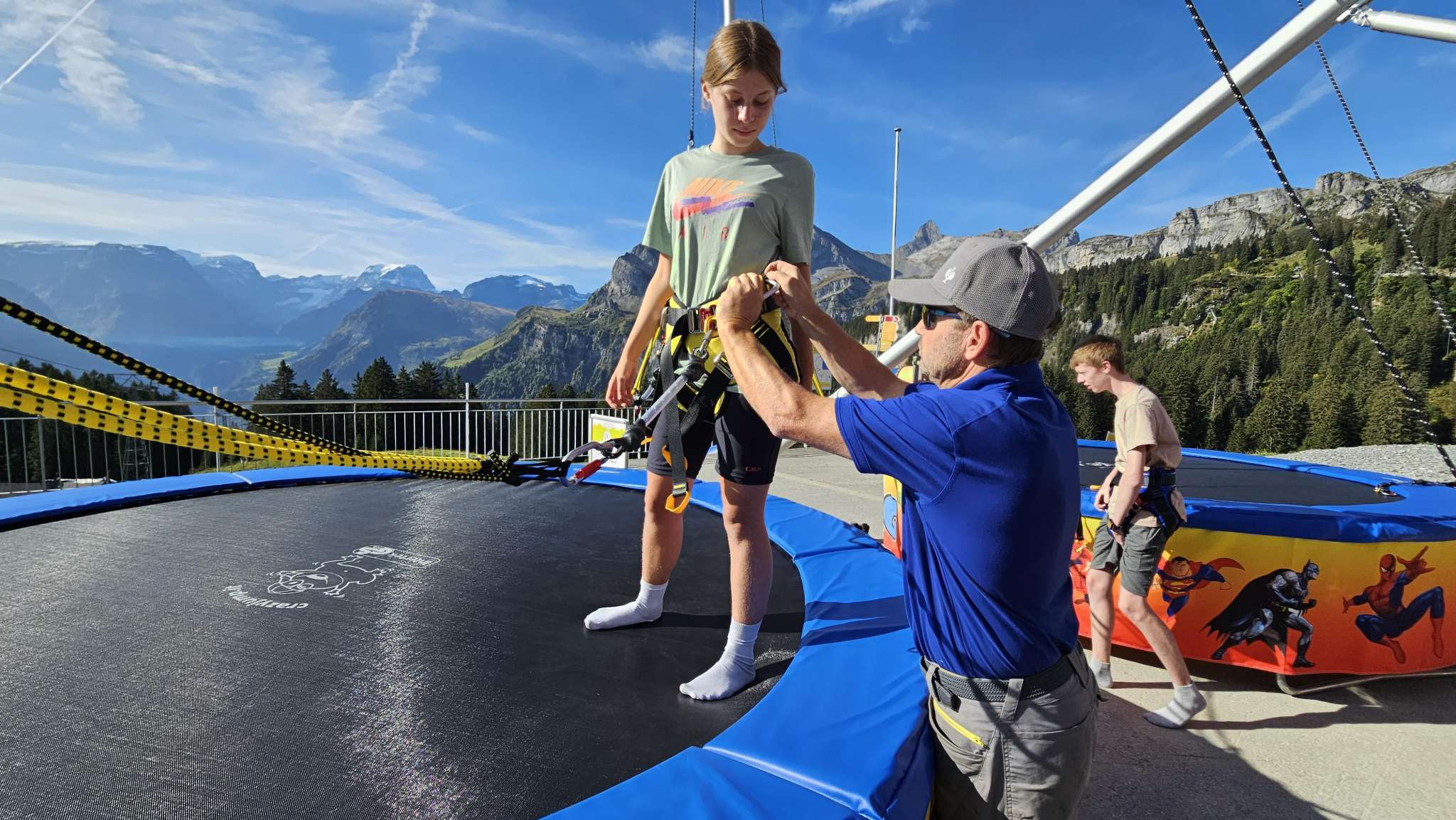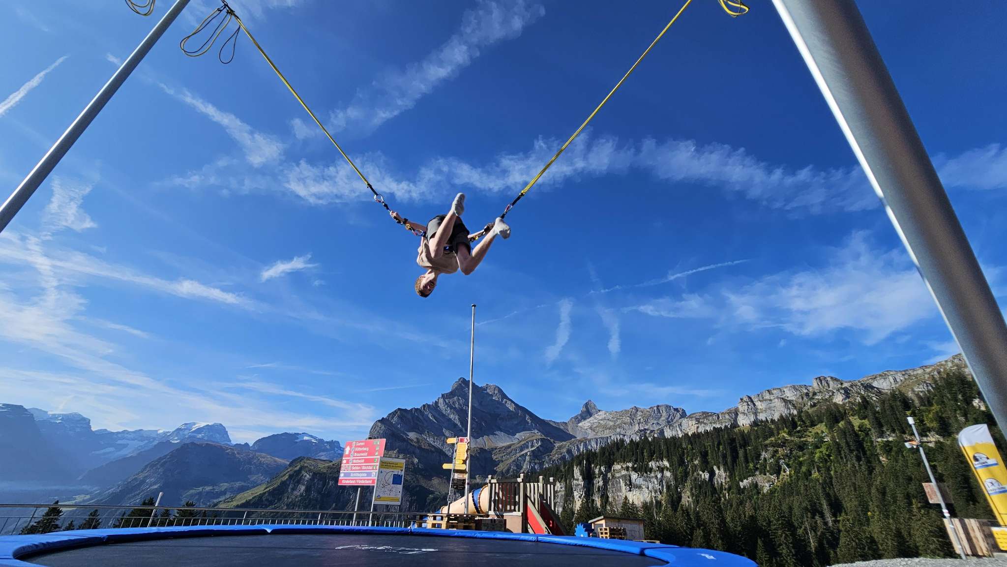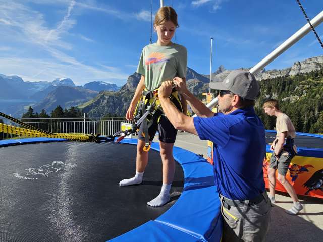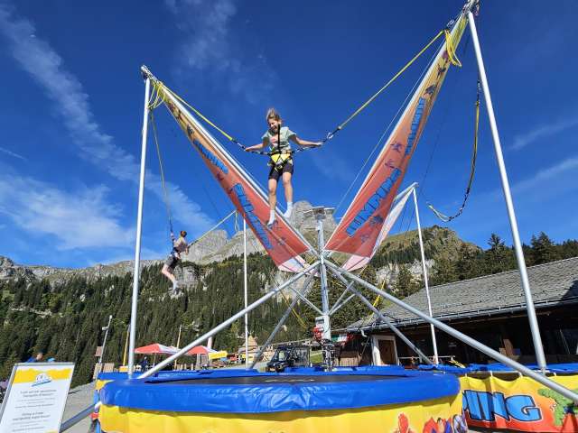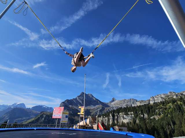 Die Anlage umfasst zweiTrampoline, auf denen Kinder und Erwachsene waghalsige Sprünge vollführen und einen kurzen Moment der Schwerelosigkeit geniessen können. Sprunghöhe und Schwierigkeitsgrad liegen ganz im Ermessen der Springer. Die stabilen Seile sorgen jedenfalls für maximale Sicherheit. Nervenkitzel und unbeschwerter Spass sind somit garantiert.