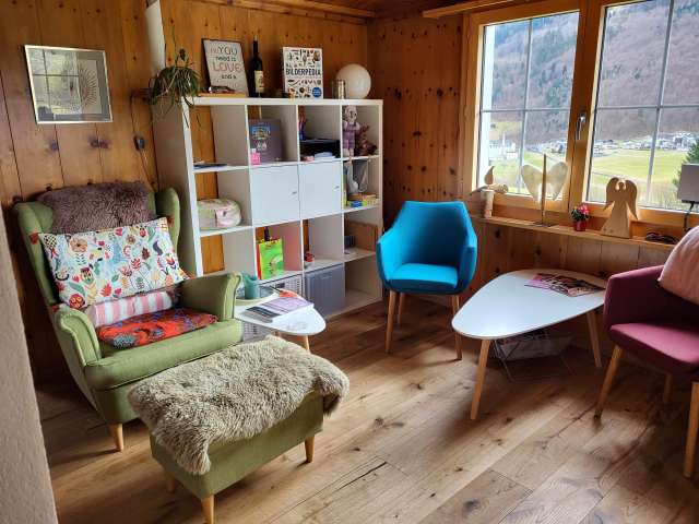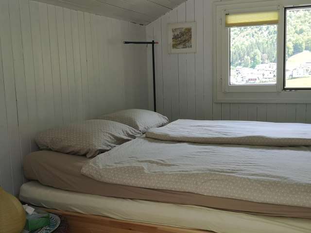 Das Gästezimmer im OG ist über eine schmale Treppe erreichbar und einfach eingerichtet. Ebenfalls im OG lädt eine gemütliche Sitzecke zum Lesen ein. Das gemütliche Arvenstübli mit Kachelofen im EG darf mitgenutzt werden. Das sehr grosse Badezimmer (mit Wanne und Dusche) wird ebenfalls gemeinsam genutzt. Die Küche kann auf Anfrage mitbenützt werden. Frühstück (Brot, Butter, Konfitüre, Ei, Käse, Kaffee oder Tee) biete ich für CHF 10/Person an (bei schönem Wetter auf der Terrasse serviert). Bezahlung vor Ort.