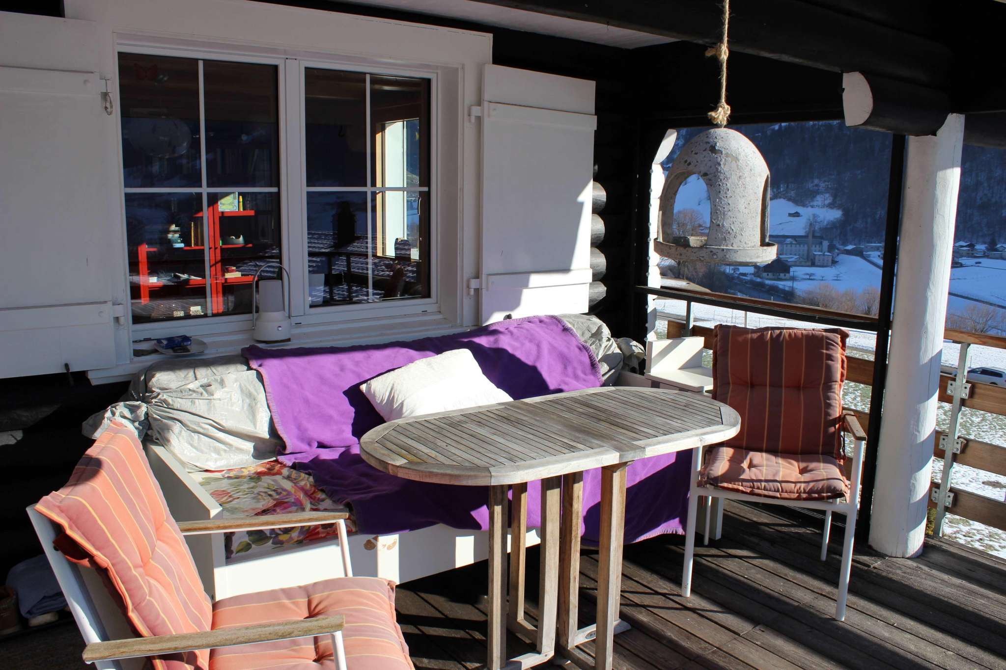 Das Chalet liegt leicht erhöht ganz am Ende von Nidfurn und ist über eine Treppe von der Hauptstrasse her erreichbar. Der Ausblick von der geschützten, überdachten Süd-Terrasse zum Tödi ist atemberaubend.