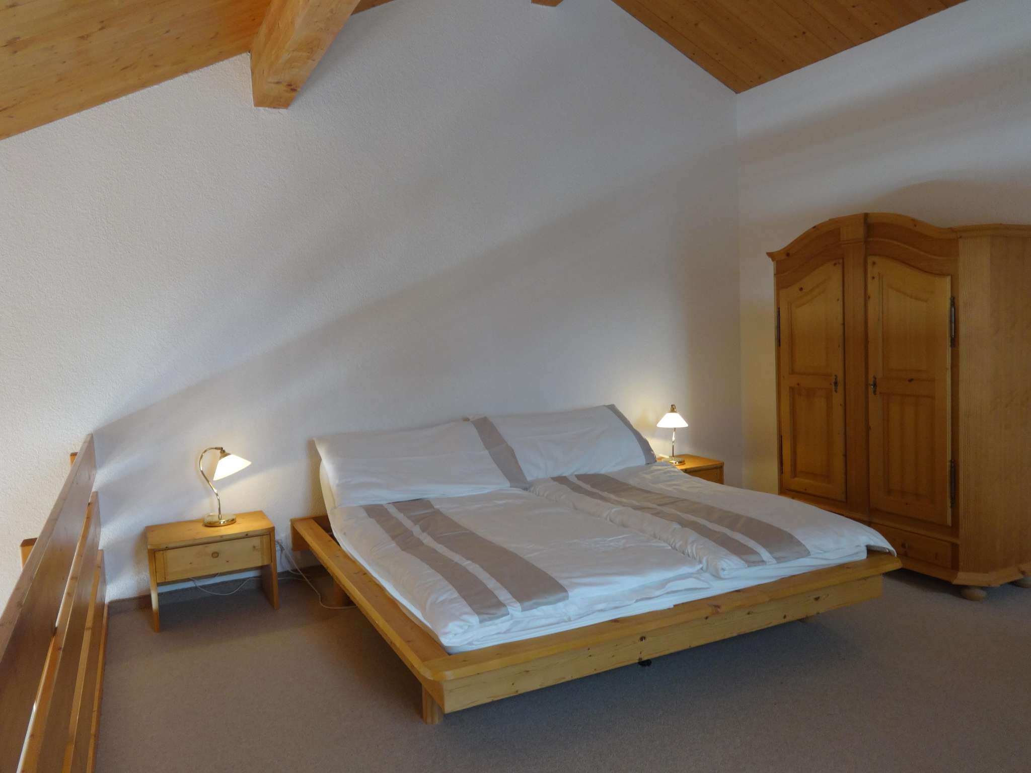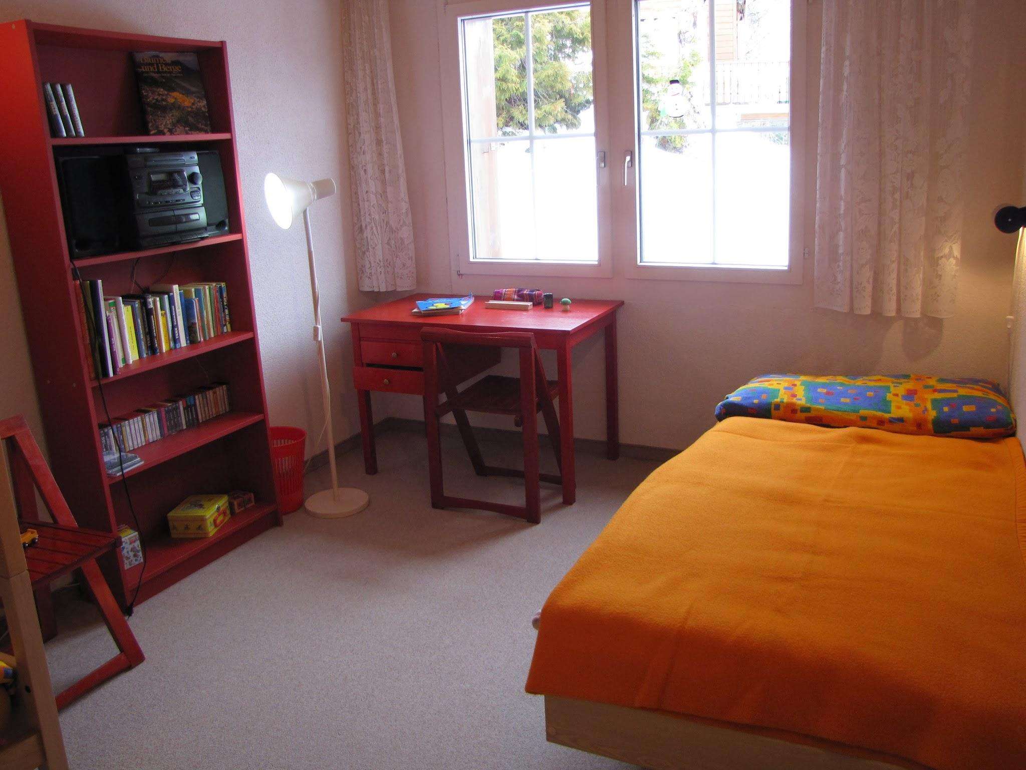 Die Maisonette-Ferienwohnung im Chalet Sunnebüchel verfügt über zwei Schlafzimmer, die wie folgt ausgestattet sind: ein Doppelbettschlafzimmer mit einem zusätzlichem kleinen Schrankbett und einem weiteren Zimmer mit einem Einzel- und einem Kajütenbett.