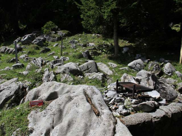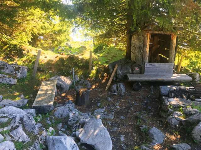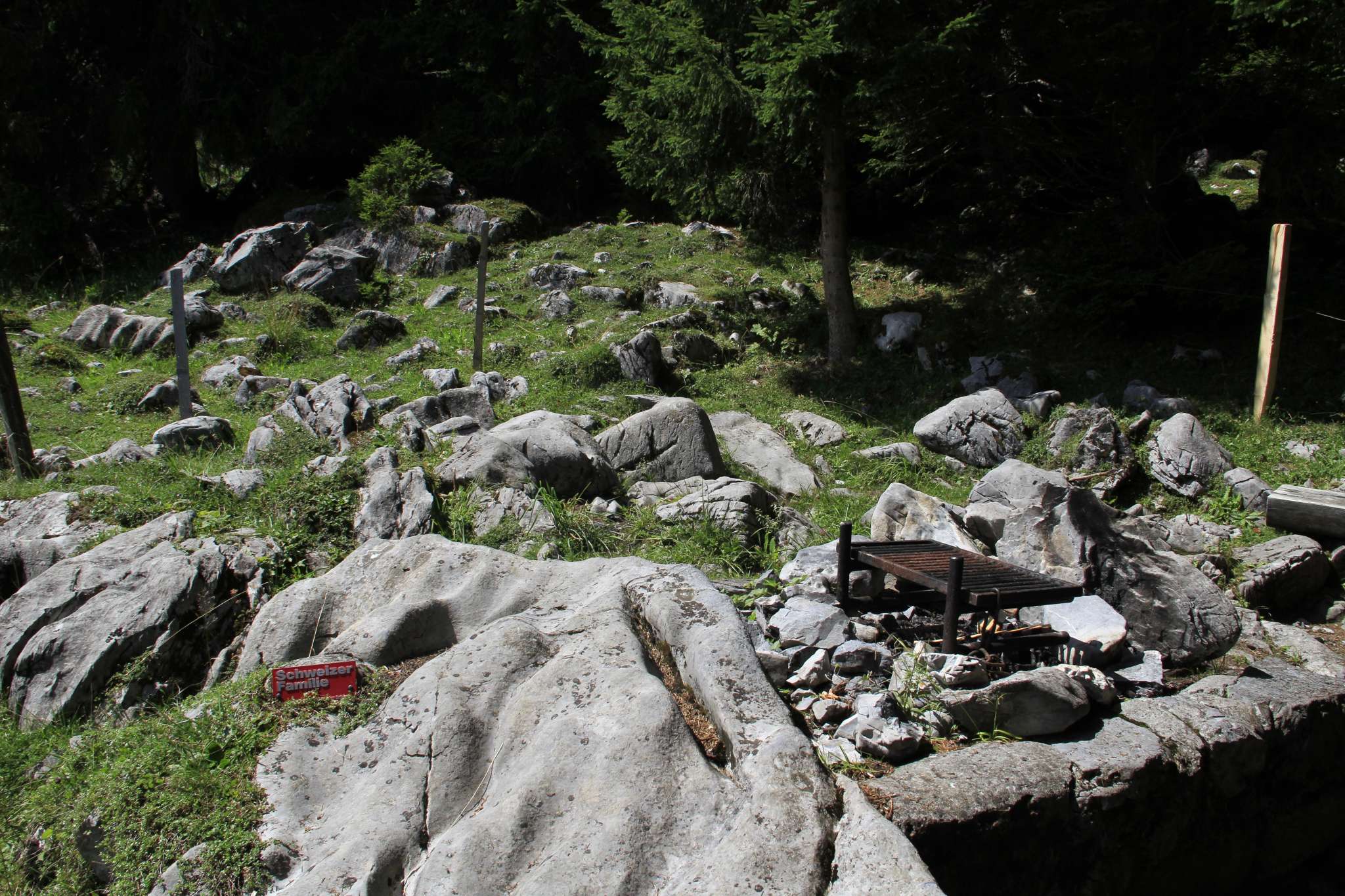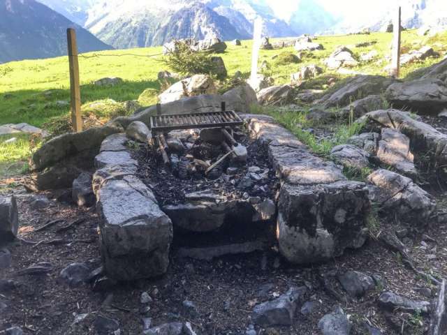 Die Feuerstelle ist eingezäunt und hat einen verstellbaren Rost. Feuerholz ist vorhanden. Rundum geniesst man eine schöne Aussicht auf die Bergwelt. Die Feuerstelle ist eher klein und schön schattig zwischen den Bäumen gelegen. Mehrere Steine bieten zusätzliche Sitzmöglichkeiten.