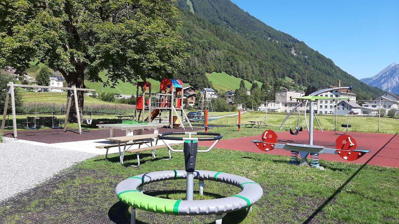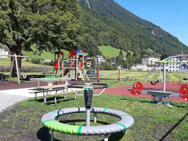 Grosszügiger Spiel- und Fussballplatz in Leuggelbach. Viele verschiedene Spielgeräte wie ein drehbarer Kletterbaum, Kletterturm mit Rutschbahn, 3-fach Schaukel, 360 Grad Dinoschaukel, Dreisitzer-Karussell, Drehspiel, Doppel-Wippe und Slackline.