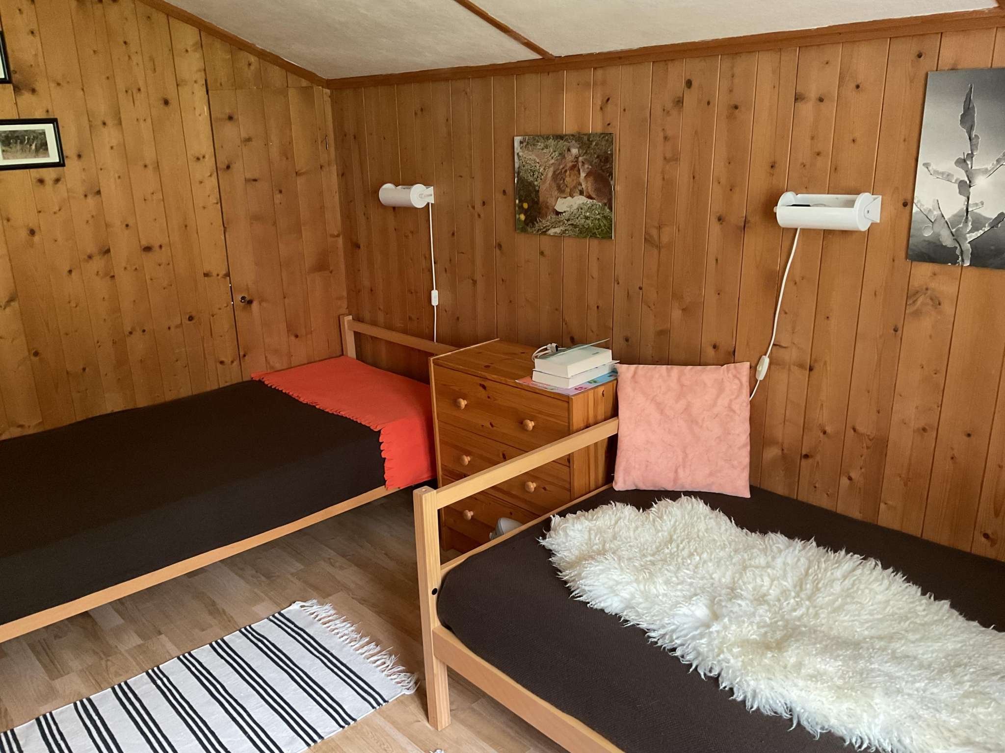 Die Ferienwohnung verfügt über zwei Schlafzimmer, die wie folgt ausgestattet sind: ein Zimmer mit einem Doppelbett und das zweite Zimmer mit zwei Einzelbetten.