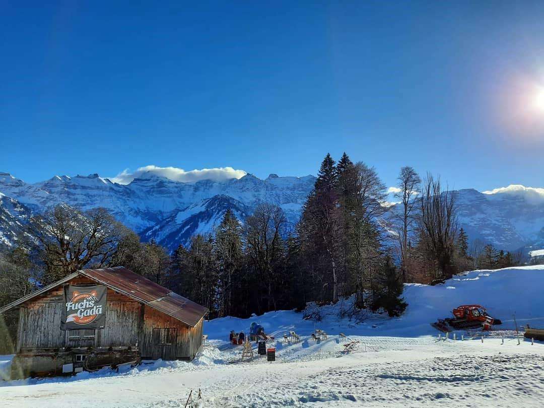 - Zu Fuss: Da der Gadä am Pistenrand liegt, folgt der letzte Abschnitt zu Fuss zwischen der Hüttenbergstrasse und dem Gadä über den Schnee. Unbedingt gutes Schuhwerk anziehen, da der Weg nur gestampft ist. Bitte der Markierung folgen, keine anderen Pisten überqueren!