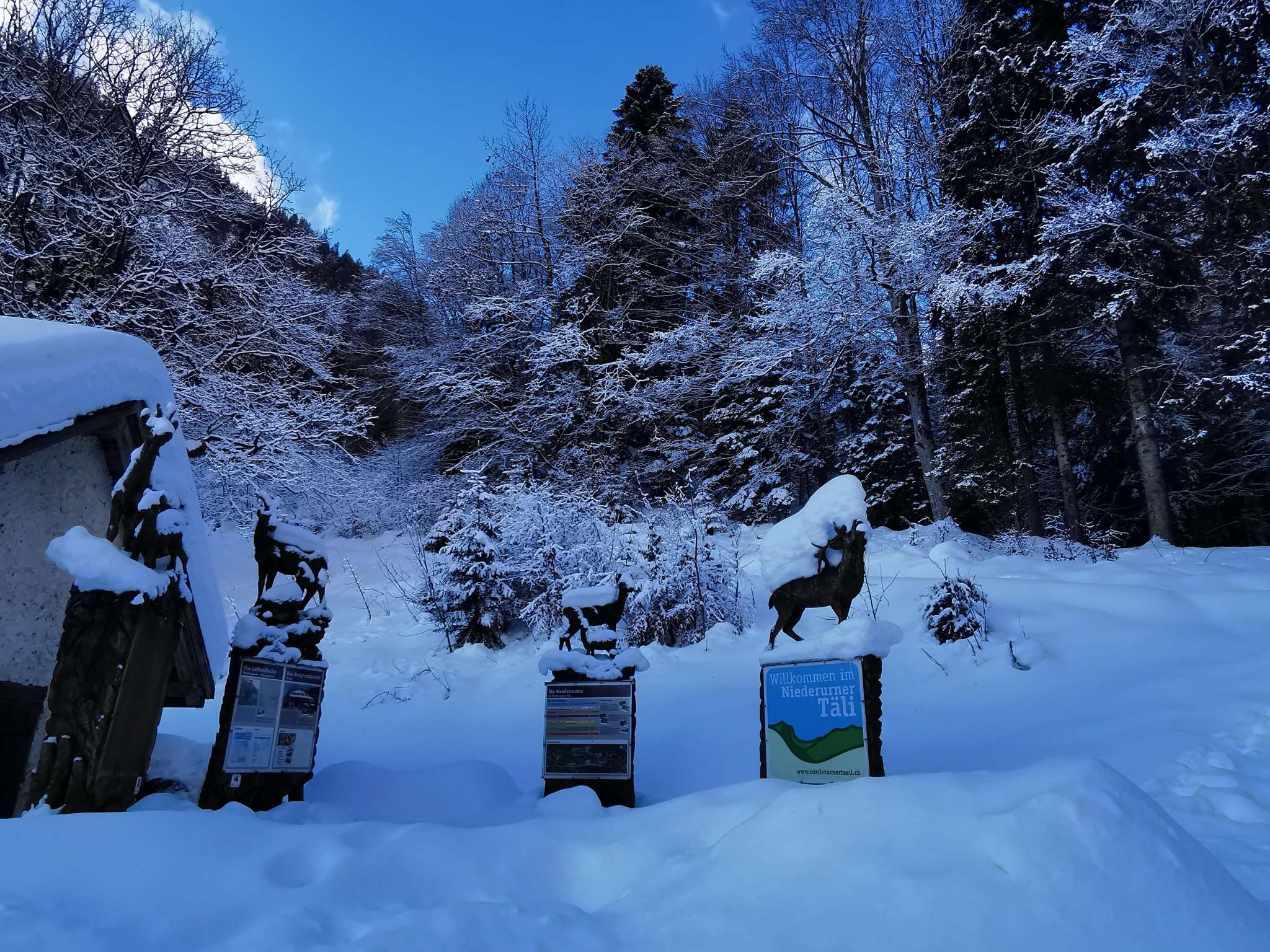 Im stillen Niederurner Täli sind die teilweise eingeschneiten Holzskulpturen am Wegrand besonders reizvoll!