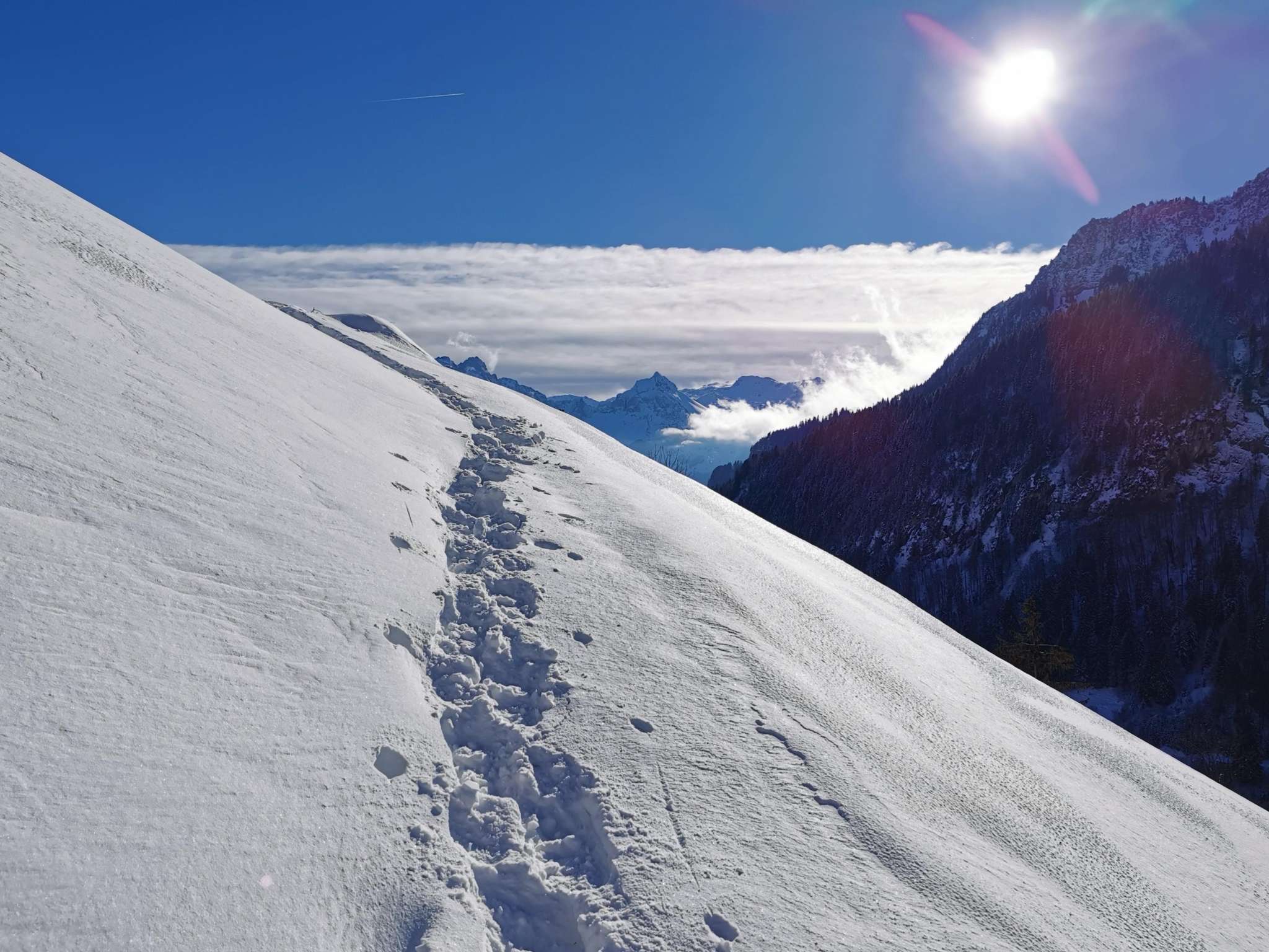 Diese leichte Tour führt über den Skulpturenweg an den Südhang des Hirzlis. Zahlreiche Holzskulpturen des einheimischen Holzbildhauers Thomas Jud säumen den Weg im tief verschneiten Bergwald.
