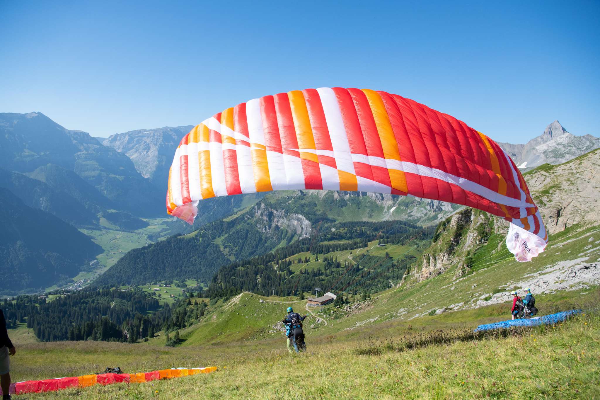 Das Gleitschirm-Eldorado kann von einem oder mehreren Piloten benützt werden. - Leicht abfallende Alpwiese. Schirm unbedingt innerhalb der zwei schwarzen Pfosten auslegen. (Siehe Foto)