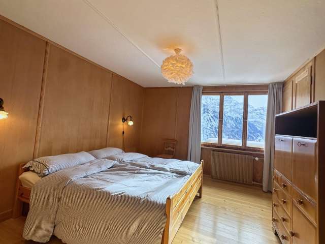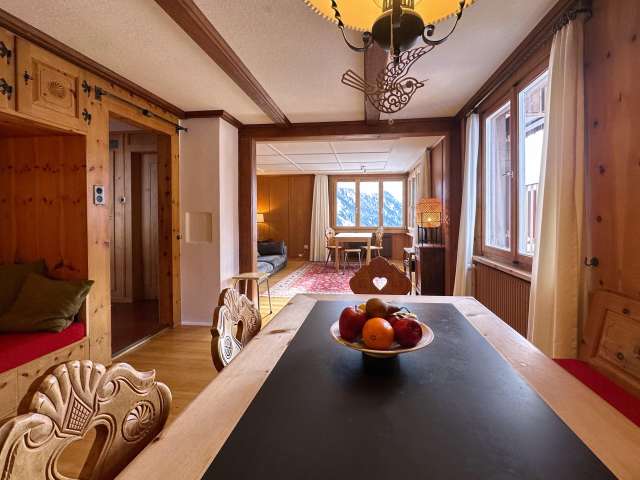 Details zur Unterkunft: Die schöne Ferienwohnung verfügt über zwei Schlafzimmer, eines mit Doppelbett das andere mit zwei Einzelbetten. Bei Bedarf bietet die Wohnung bequem Platz bis zu 5 Personen. Im grosszügigen Wohn-Esszimmer befindet sich eine weitere Schlafgelegenheit in der gemütlichen Arvenstube. Eine gut ausgestattete Küche mit Elektroherd, Backofen, Geschirrspüler, Microwelle, Raclette-Ofen und Kaffeemaschine. Das Badezimmer ist mit Bad/Dusche und Waschmaschine ausgestattet. Schlitten können zur Verfügung gestellt werden.