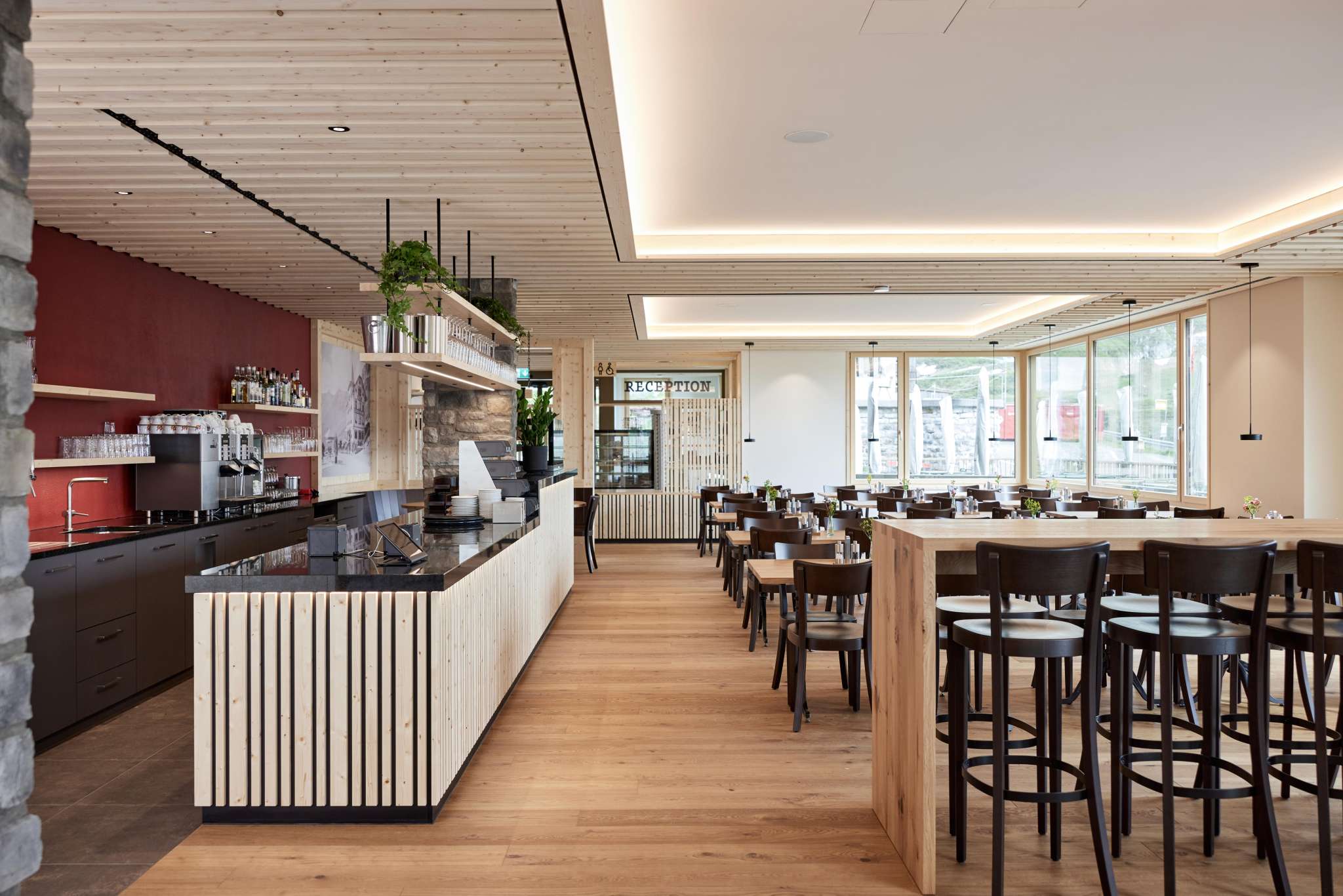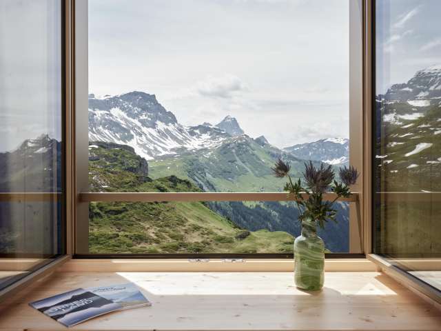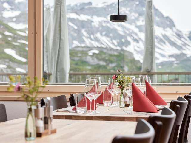 Geniessen, aber so richtig: Beeindruckend der Blick von der Terrasse – aber auch durch die grossen Restaurantfenster. Die Gaststube ist gemütlich, zur Bergwelt passend eingerichtet, mit Stil und mit viel Sinn fürs Detail.