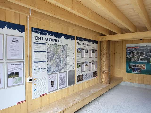 Informationsort für Wanderungen und Bergtouren in der Umgebung, Übersicht der Sehenswürdigkeiten, Taxi-Warteplatz und Spielplatz.