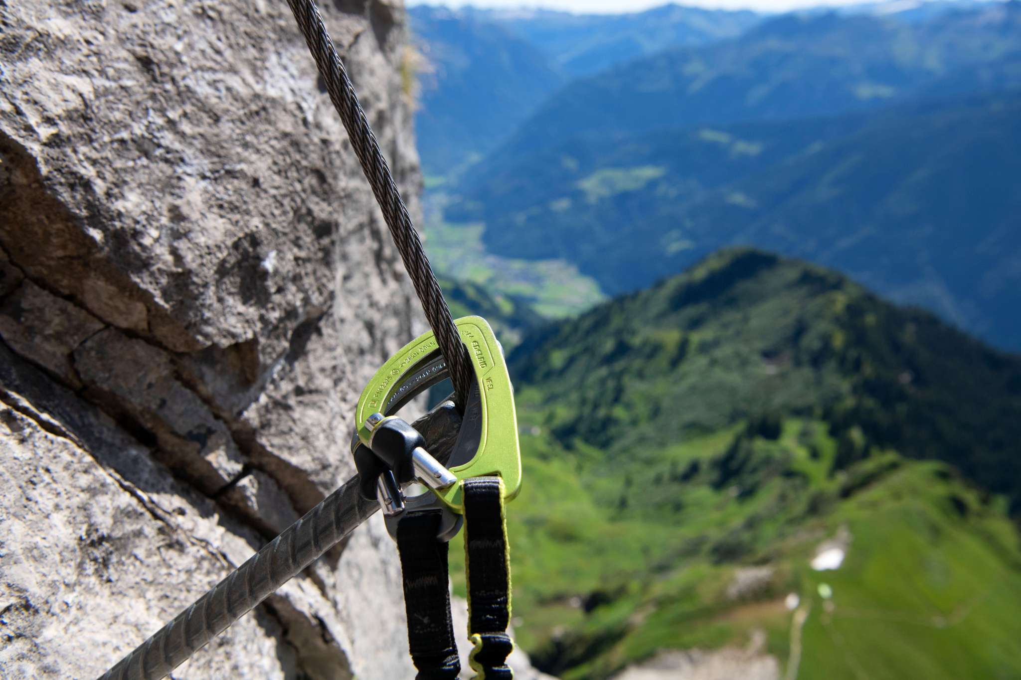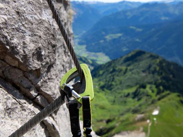Ferrata Bloc blockiert sofort am Seil ohne freien Fall, Ausruhen an jeder Position möglich. Als zusätzliche Fallsicherung - kann bei K5-Routen von Nutzen sein.