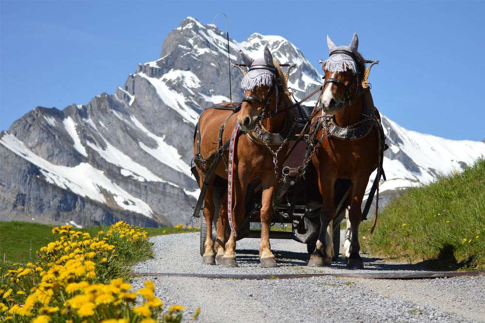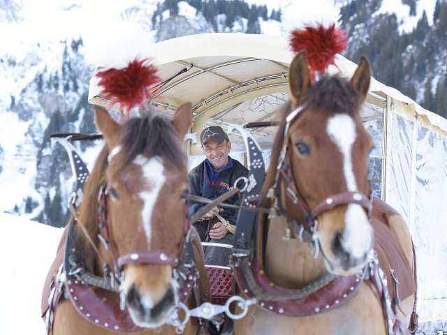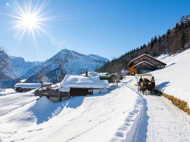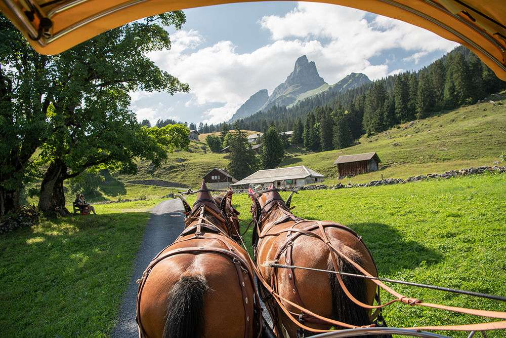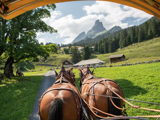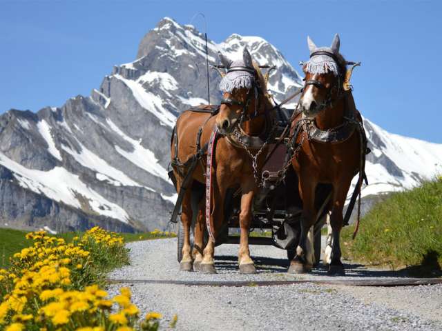 Geniesst eine gemütliche Fahrt mit der Pferdekutsche durch das autofreie Braunwald, vorbei an den weitverstreuten Bauernhöfen im typischen Glarner Baustil, an schmucken Chalets, immer mit der imposanten Bergkulisse als Begleiter.