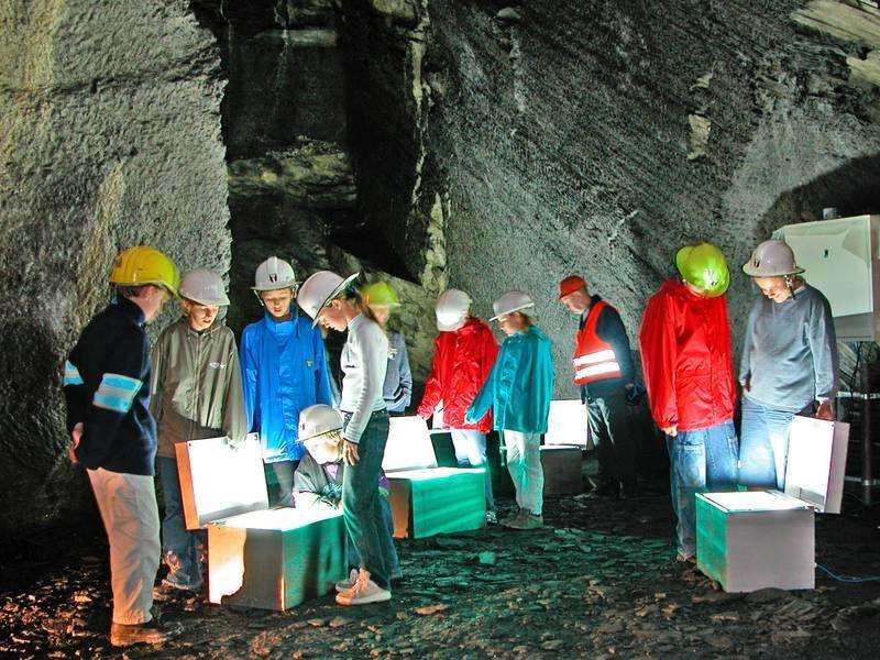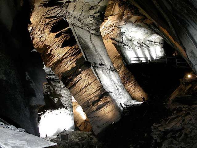 Lassen Sie sich bezaubern von den gigantischen unterirdischen Hallen im ehemaligen Schieferbergwerk im Landesplattenberg Engi und der magischen Stimmung im Innern des Berges