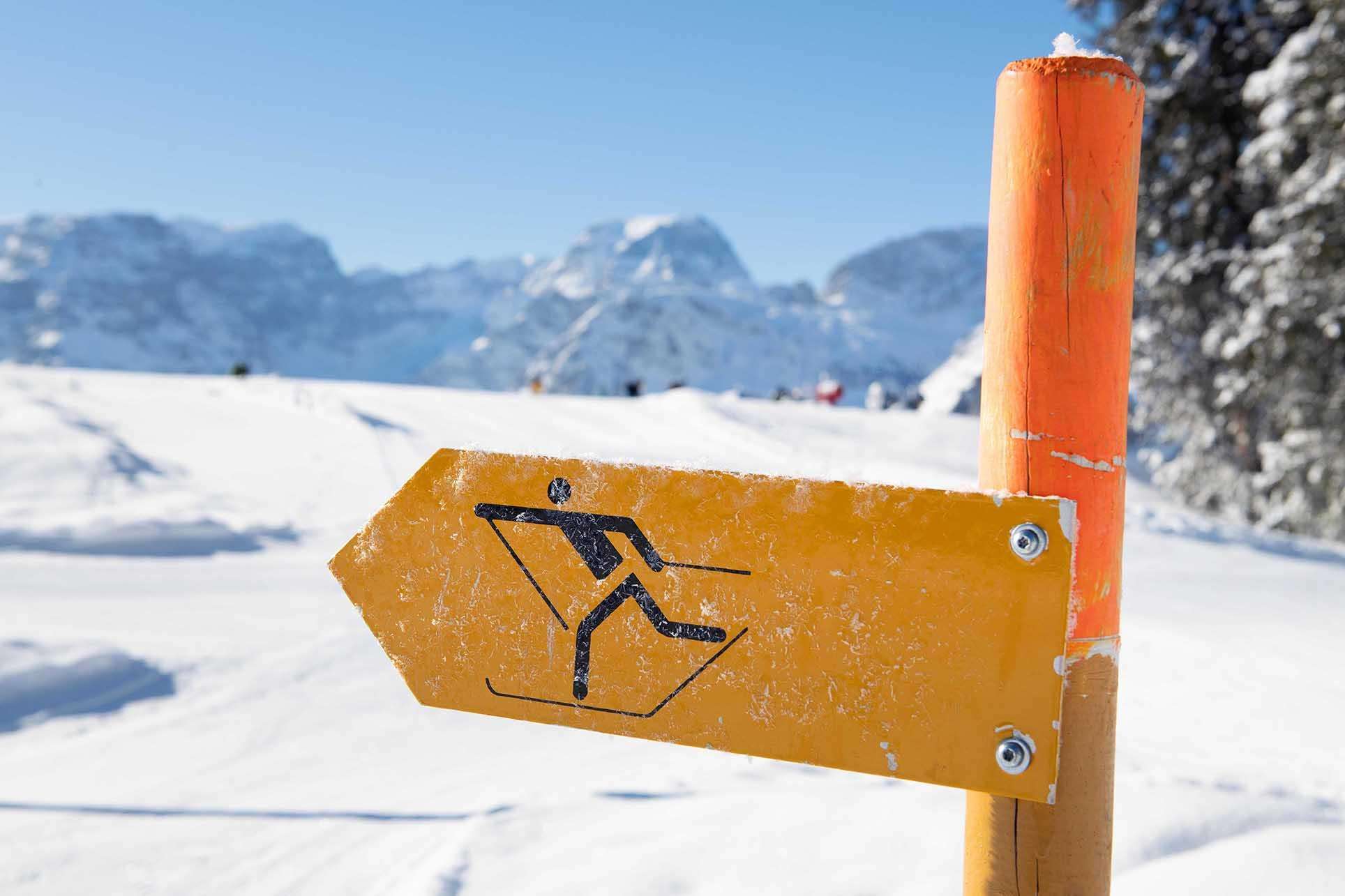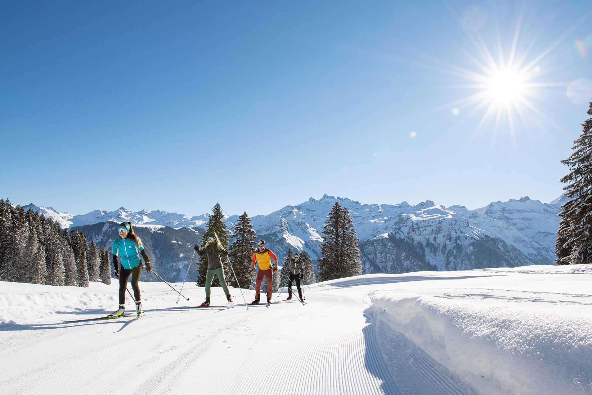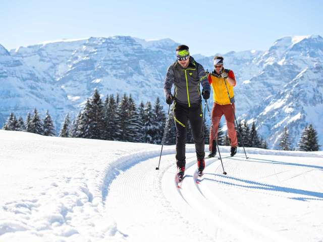Über Wiesen und durch verschneite Wälder mit einer Höhendifferenz von 200 Metern und einem einmaligem Blick auf das fantastische Glarner Bergpanorama.