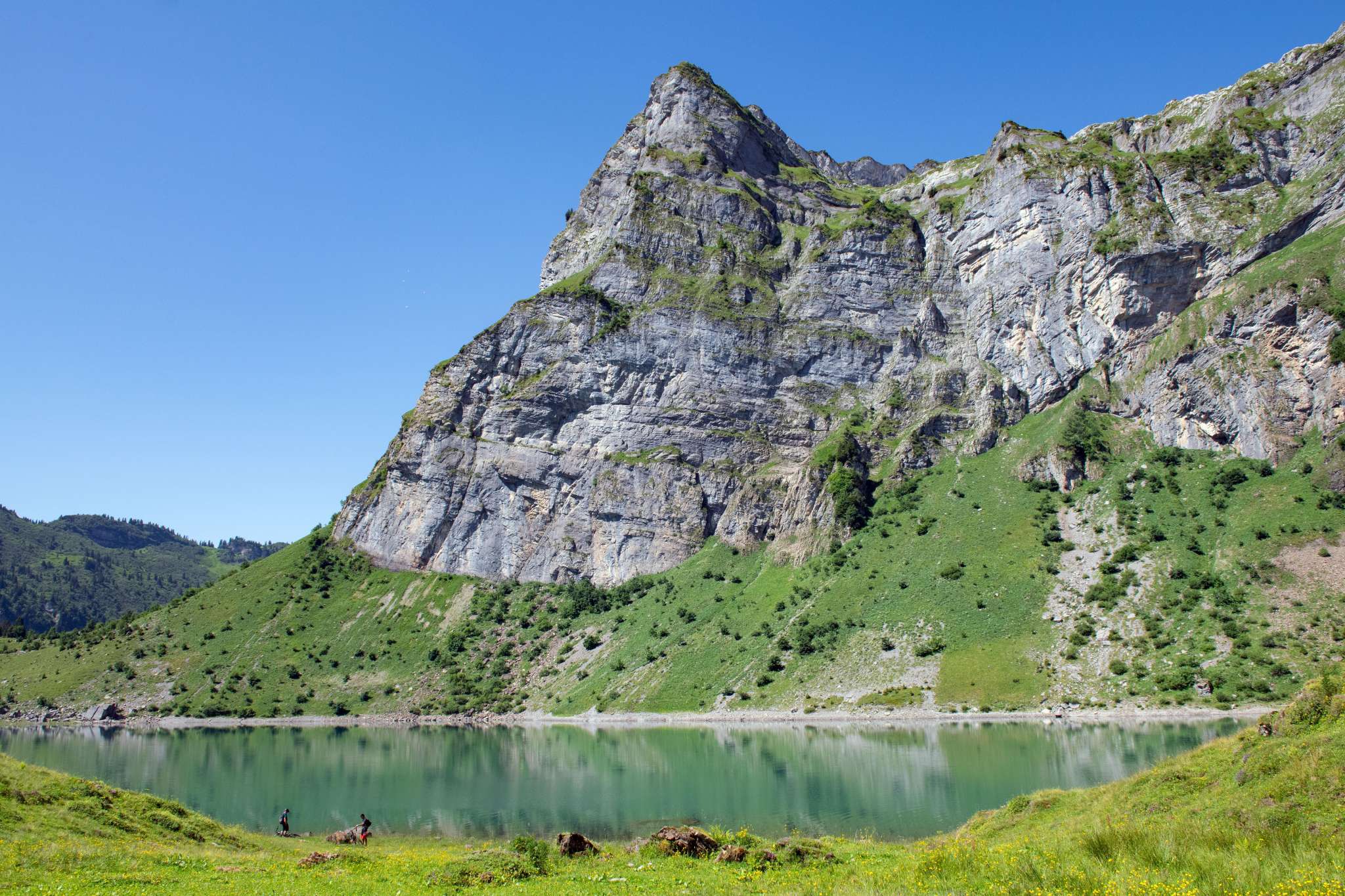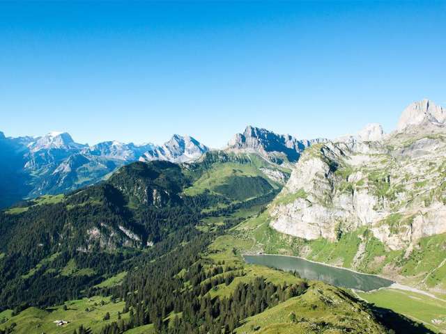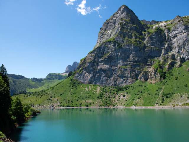 Hier heisst es Inne halten und sich von der atemberaubenden Kulisse verzaubern zu lassen. Laut hallt das Echo vom eindrucksvollen Glärnischmassiv zurück. Von dort geht es vorbei am Mittelstafel der Alp Oberblegi bergab zur Bergstation der Brunnenbergbahn.