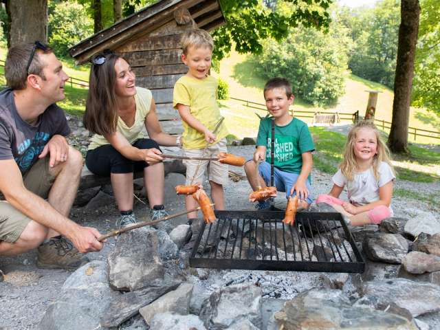 Beim Spielplatz hat es auch eine Feuerstelle mit Grillrost und Holz.