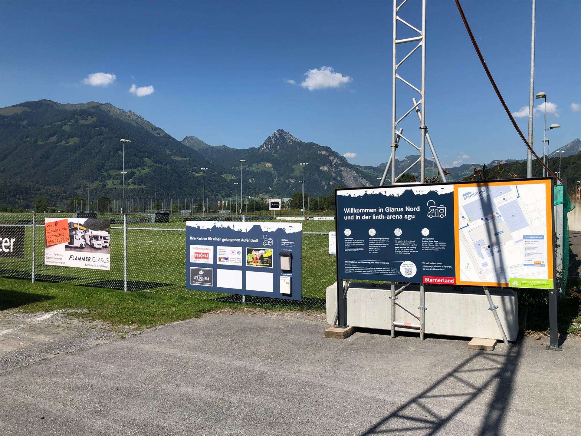 Kosten pro Fahrzeug und Nacht: CHF 22.- inkl. Kurtaxen sowie Benutzung der Toiletten und Duschen in der lintharena.