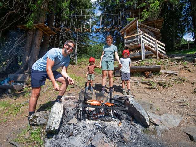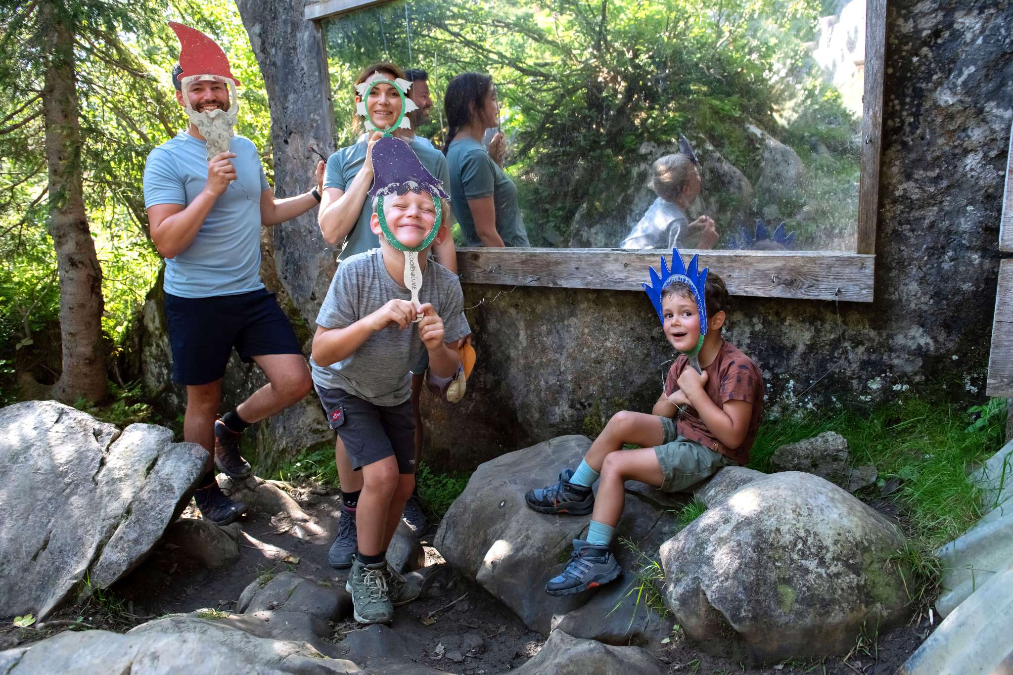 Der Zwerg Bartli mit seinem langen Bart, seiner roten Hose und seinem grünen Pullover kommt von Mitte Juni bis Oktober aus seinem Hüttli, um Familien willkommen zu heissen und ihnen seinen Wald zu zeigen. Der Weg führt vorbei am mächtigen Brummbachfall mit dem Wasserspielplatz, am kleinen Holzhaus der Tante Tiidi, welche einst dem Zwerg die Hosen flickte. Wer die Edelsteinspalte entdecken geht, wo Bartli den leuchtend roten Edelstein fand, findet noch seinen Pickel und seine Grubenlampe. Man könnte meinen, er sei soeben aus der Miniaturschlucht herausgesprungen. Vielleicht hinauf in die Höhle von Zwerg Ägiidi, wo dessen Tischchen und sein Bettchen stehen? Auch hier kann er nicht weit sein, denn die Grubenlampe flackert noch und im Tellerchen liegt noch etwas von seinem Znüni, welches Kinder für ihn bereitgelegt haben. Wenn Zwerg Bartli aber nicht zu Hause in seinem Rindenhüttli ist, dann trifft man ihn womöglich im Zwergenschloss bei der imposanten Spalte im Felsen an, dort wo der Thron des Zwergenkönigs steht, die Kerzen brennen und im Spiegelsaal die letzten Blumen vom grossen Zwergenball liegen.