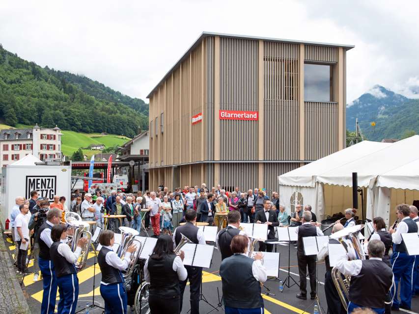Zahlreiche Gäste aus Tourismus, Politik und aus der Bevölkerung liessen es sich nicht nehmen den neuen Bau zu Begutachten und sich am attraktiven Rahmenproramm, organisiert von der Gemeinde Glarus Süd und durch VISIT Glarnerland zu erfreuen. Standortförderer Christian Marti von der Gemeinde Glarus Süd führte gekonnt durch die festliche Eröffnungsfeier, die musikalisch von der Harmoniemusik Schwanden begleitet wurde.