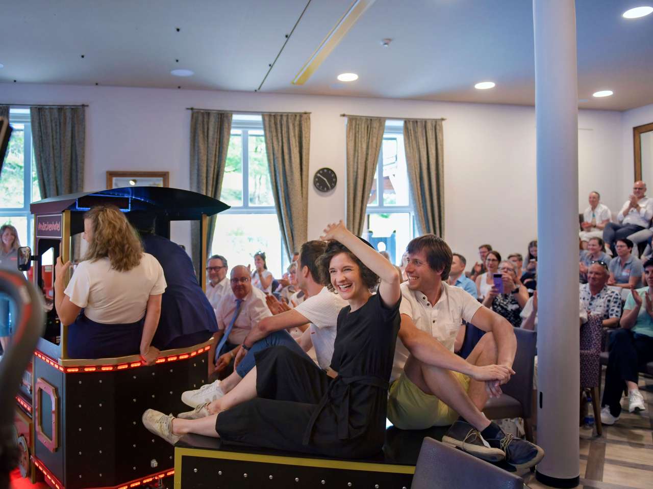 Mit Dampf: Märchenhotel-Lokomotive Emma bringt die Preisträger, die Zirkusfamilie Muggli, in den vollen Saal für Könige.