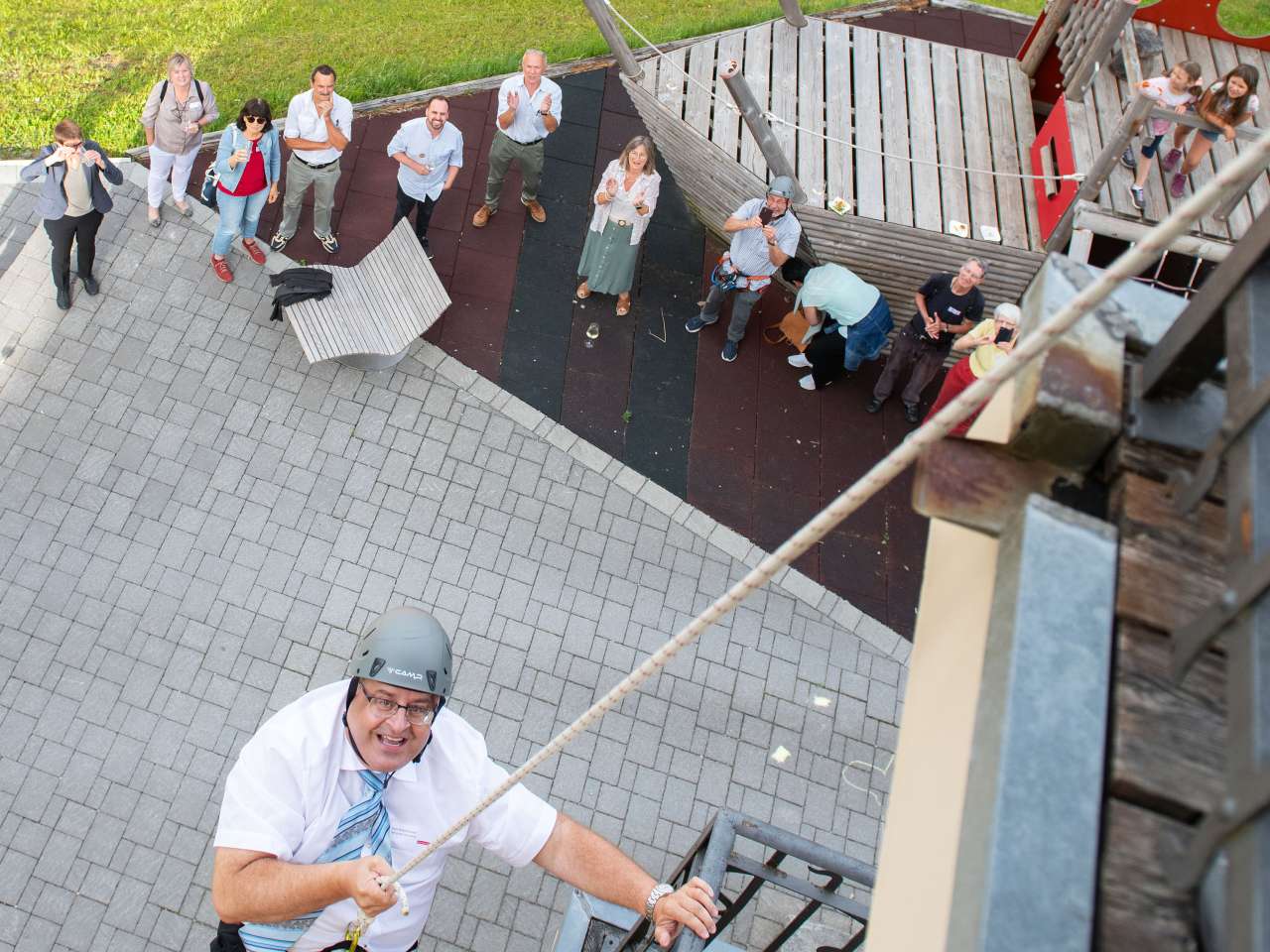 Nichts ist unmöglich: Glarus-Süd-Gemeindepräsident Hans Rudolf Forrer beweist Mut und lässt sich – gut ge-sichert – beim Rahmenprogramm abseilen.